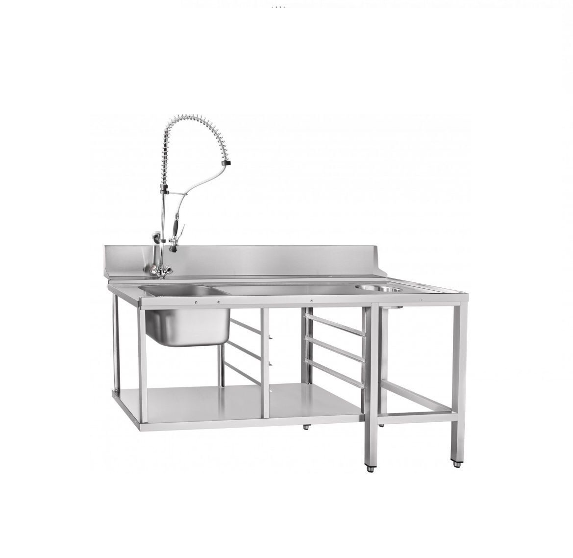 Стол предмоечный СПМП-6-7 имеет цельнотянутую ванну для предварительного ополаскивания посуды (400х400х250 мм), душирующее устройство для холодной и горячей воды, регулируемые по высоте ножки, нижнюю полку и направляющие для установки трех кассет 500х500 мм. Крепление к посудомоечной машине осуществляется с помощью верхнего зацепа и нижних винтов. Путем несложного монтажа стол можно установить как в левом, так и правом исполнении.